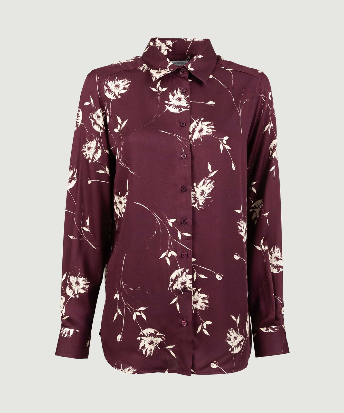 The deep wine-red base highlights the delicate floral print, adding an elegant, graphic detail against the lustrous fabric.