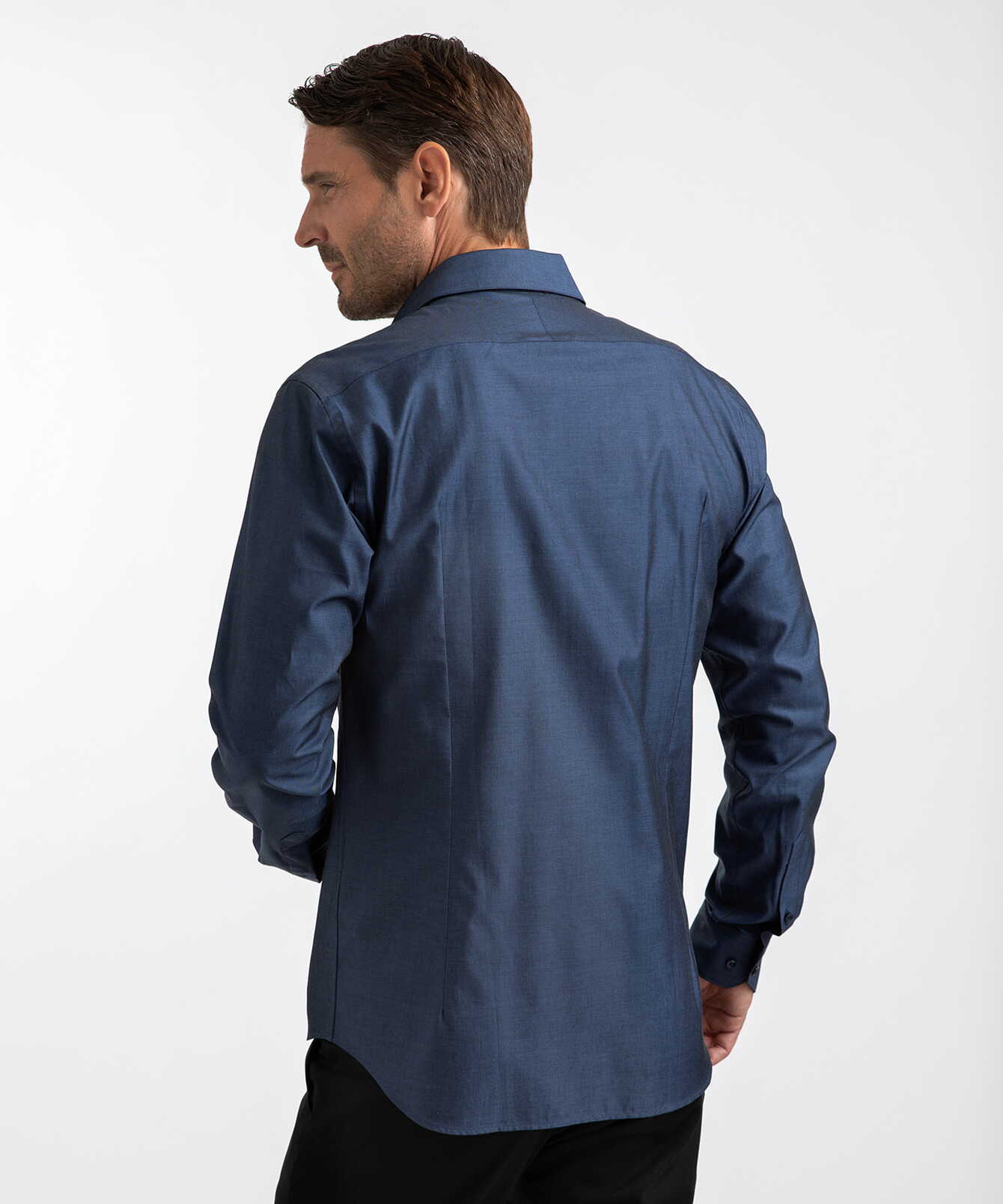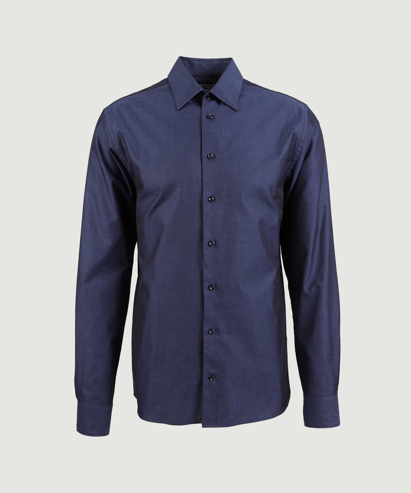 Woven in Portugal from 100% two-ply cotton, the fabric features a subtle texture that adds both character and comfort. The double-twisted yarns create a natural sheen and a smooth, almost silky touch against the skin. A shirt defined by attention to detail, where classic craftsmanship meets a refined, contemporary silhouette.
