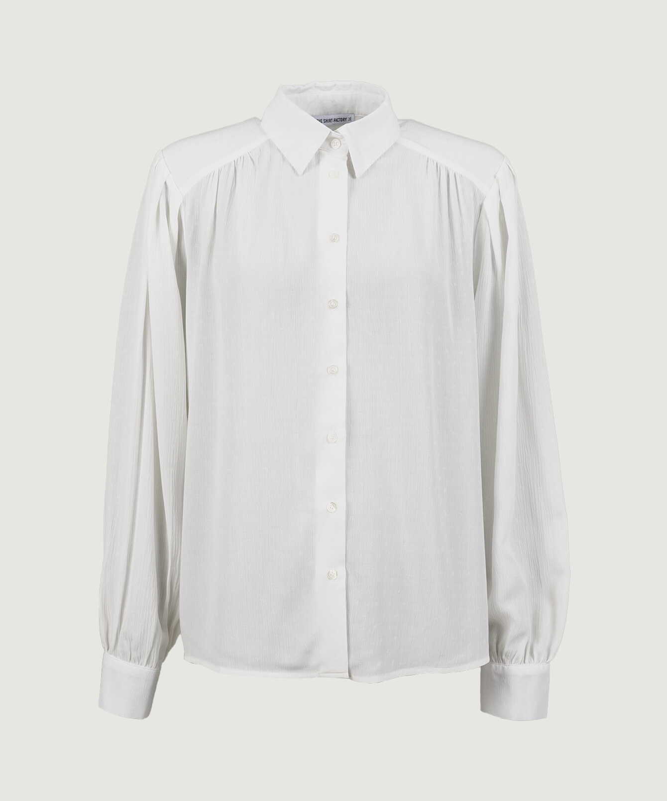 A blouse that combines simplicity with an exclusive feel. Crafted from dobby-woven viscose with a crinkled texture, the fabric features a subtle structure that gives it an elegant sheen and a fluid drape. The softly generous silhouette is balanced by a defined collar and voluminous sleeves finished with sharply tailored cuffs. Delicate gathers at the shoulders and collarbone add subtle movement and enhance the feminine expression.