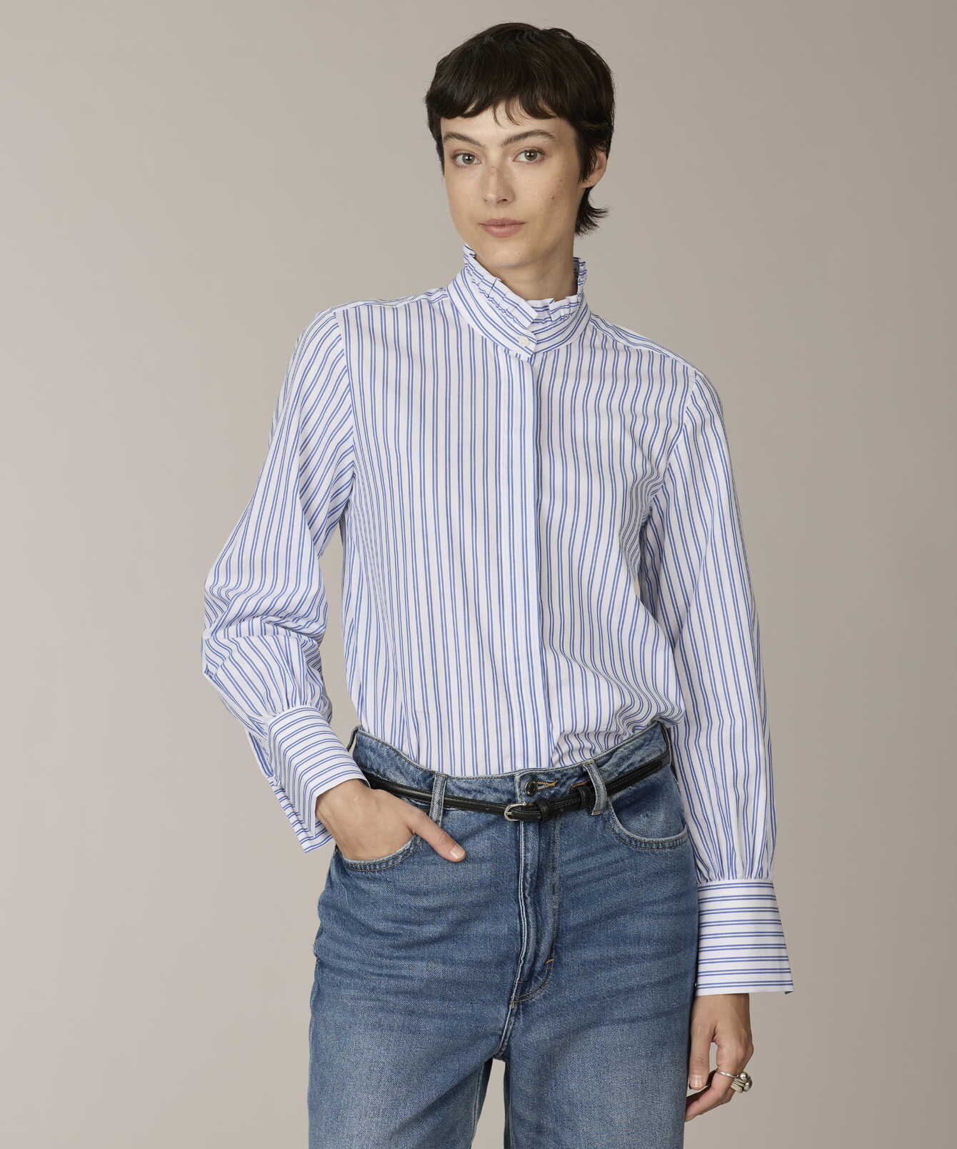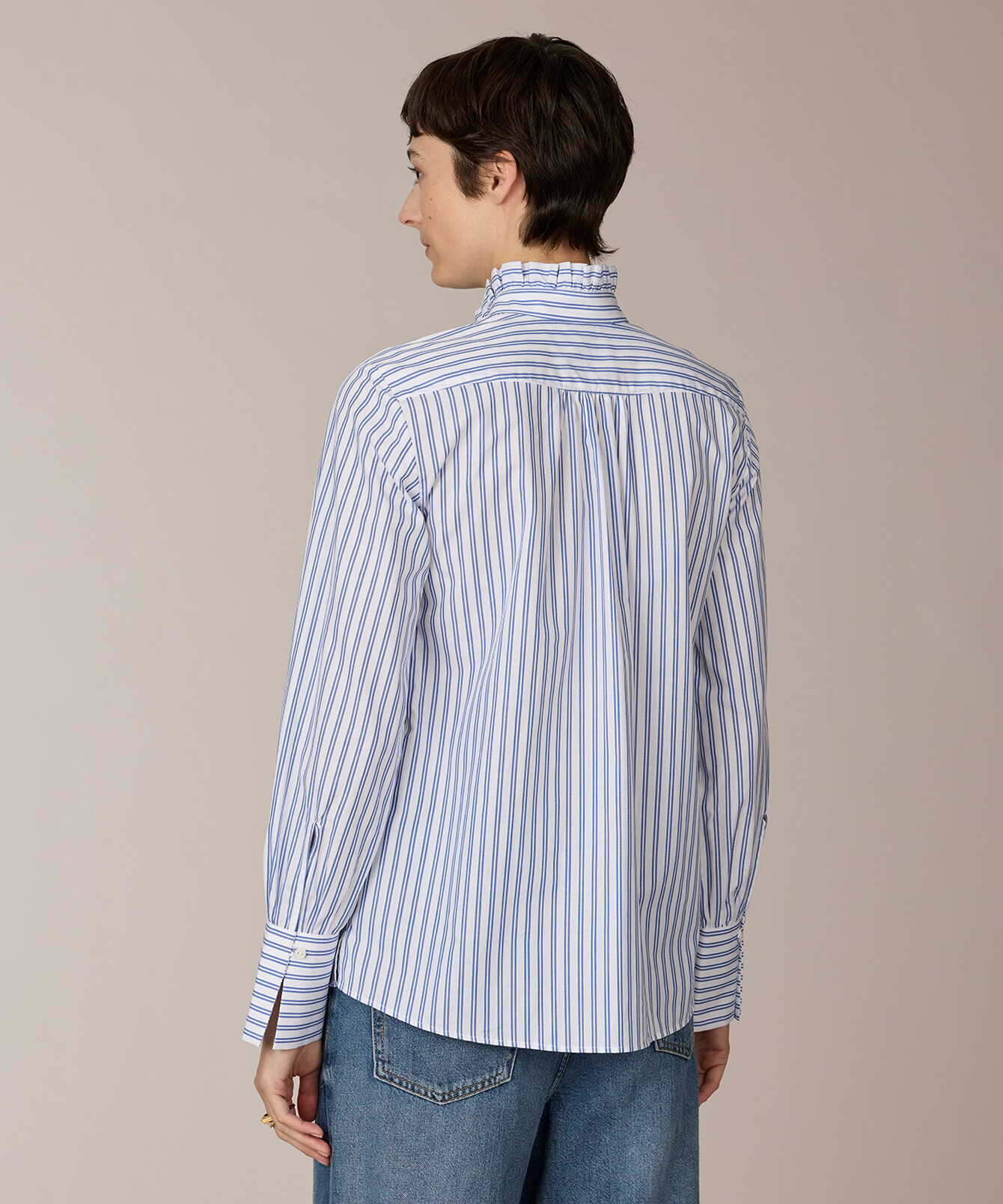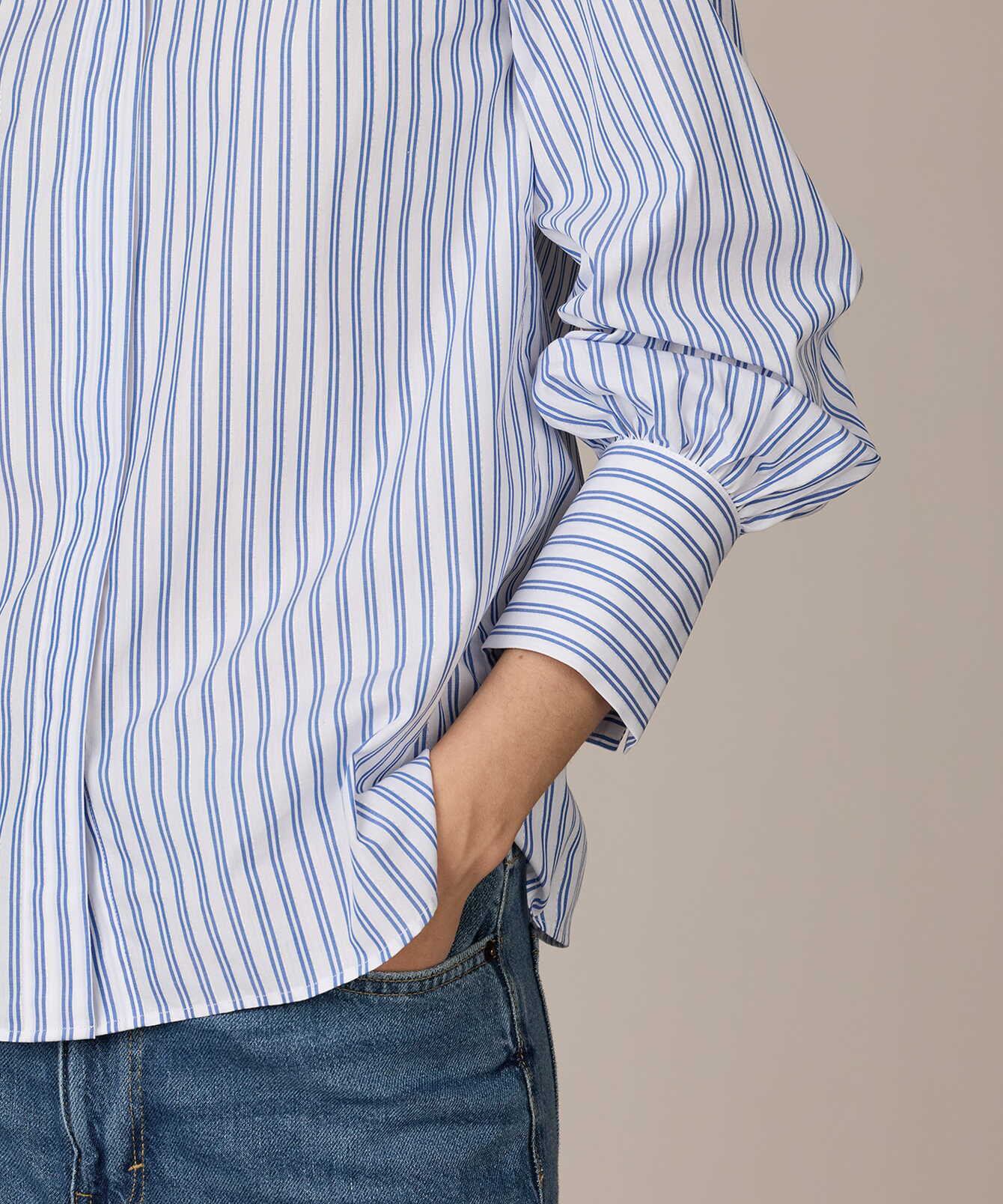 A sophisticated shirt in white cotton with blue stripes and a subtle shimmer from woven glitter thread. The band collar and hidden placket create a clean, elegant silhouette, while the wide cuffs with the option to roll up add a refined detail. The gathered yoke and rounded hem with side slits give the shirt a soft drape and natural movement. With a straight, lightly structured fit and crafted in Portugal with attention to quality and finish, this shirt is a timeless wardrobe staple with a distinct character.