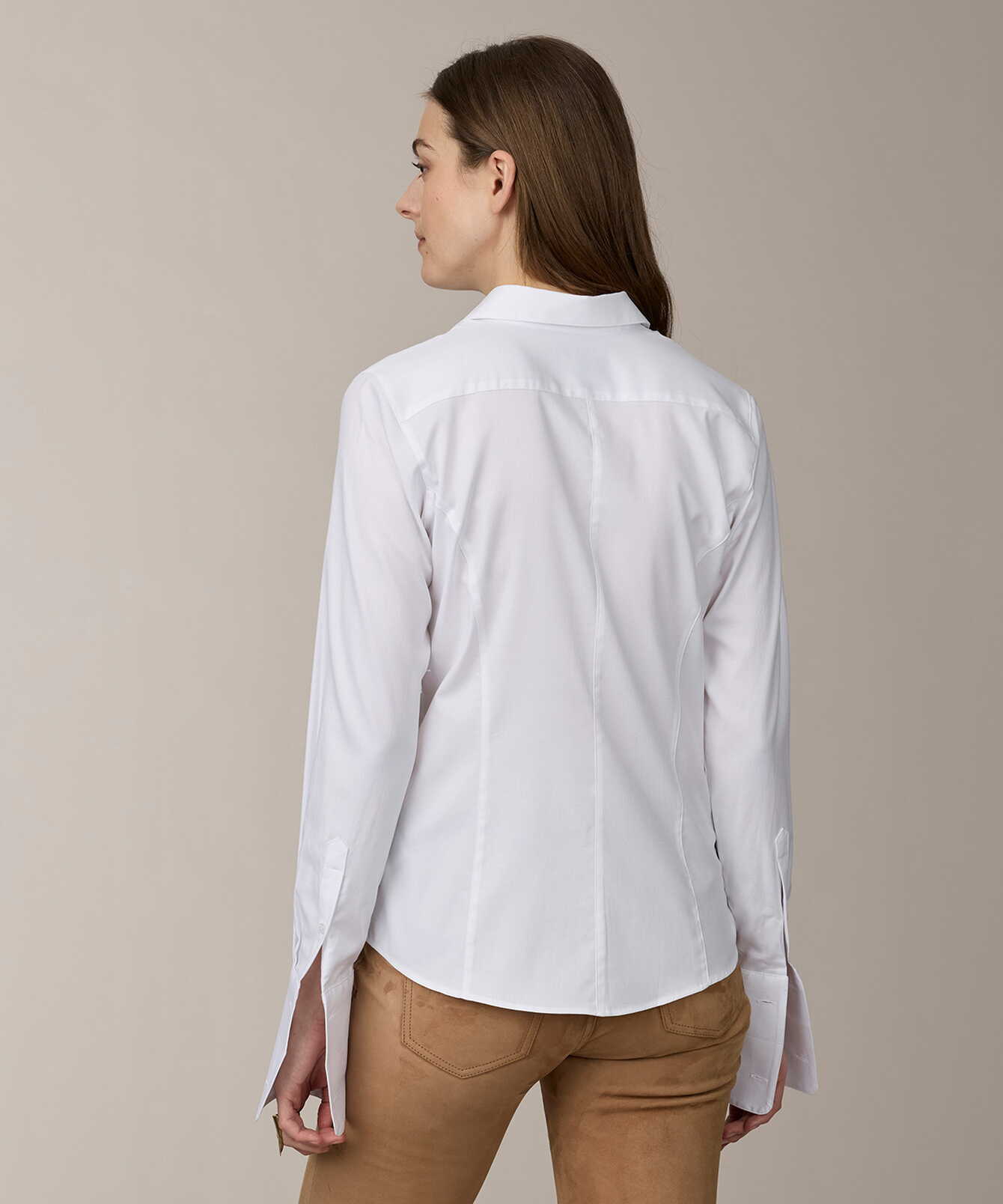 This tailored women’s shirt is crafted from a lightweight dobby fabric with a subtle texture and added stretch for comfort. The cotton and elastane blend provides a soft, fluid drape and a well-defined silhouette. The shirt features a concealed button placket, double cuffs, and a clean, understated expression. Finished in classic white and detailed with discreet logo buttons.