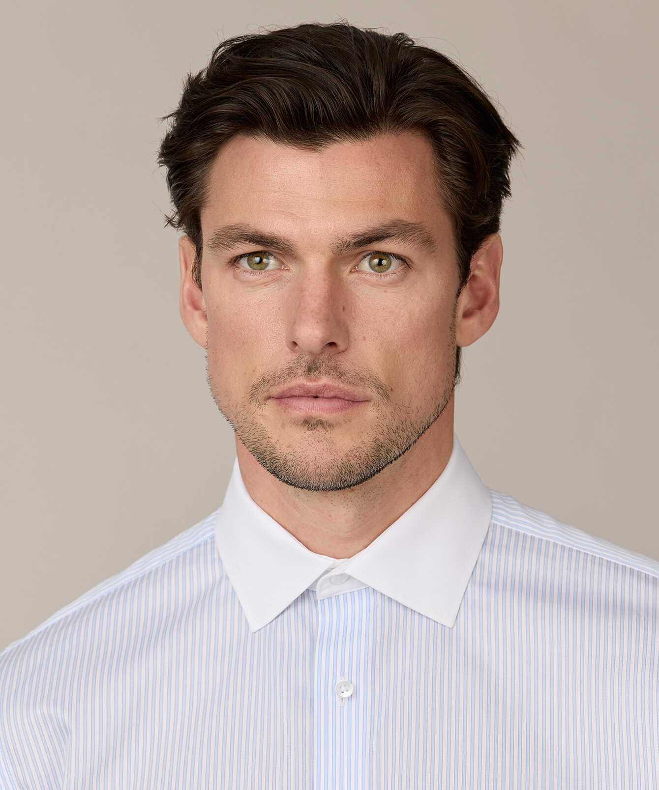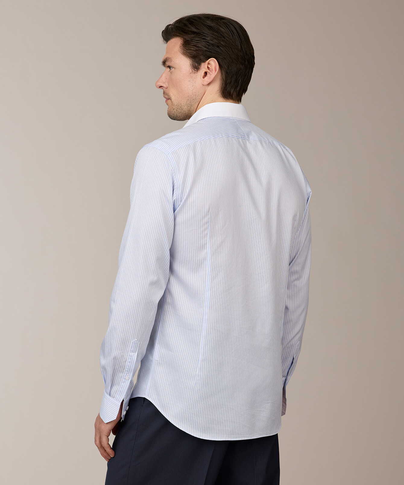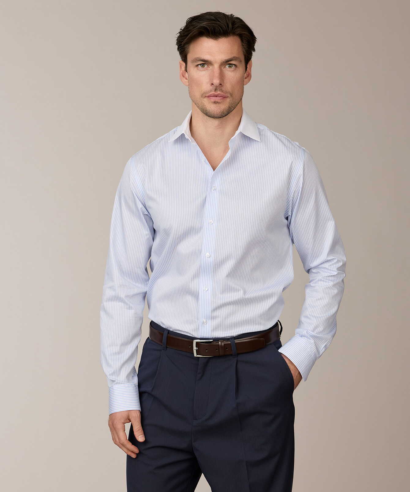 Claremont is a classic long-sleeved shirt crafted from 100% cotton twill, featuring a subtle sheen and a smooth, fluid drape. The light blue and white striped fabric is paired with a white contrast collar and inner cuffs for a sharp, contemporary look. The slim fit creates a more tailored silhouette with a modern, refined feel, while the soft drape of the fabric ensures comfort. A cut-away collar and single cuffs contribute to a polished and sophisticated appearance. Finished with Ascolite®-secured buttons for long-lasting durability.