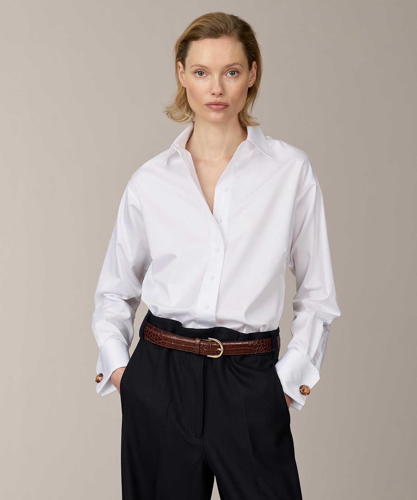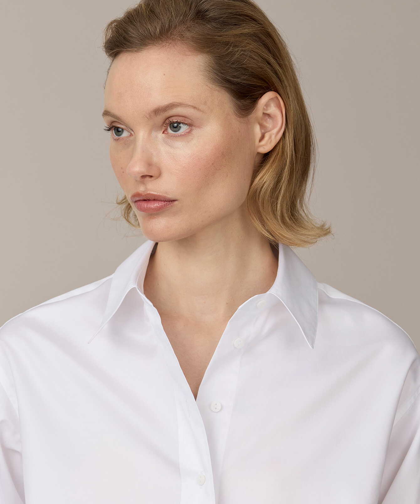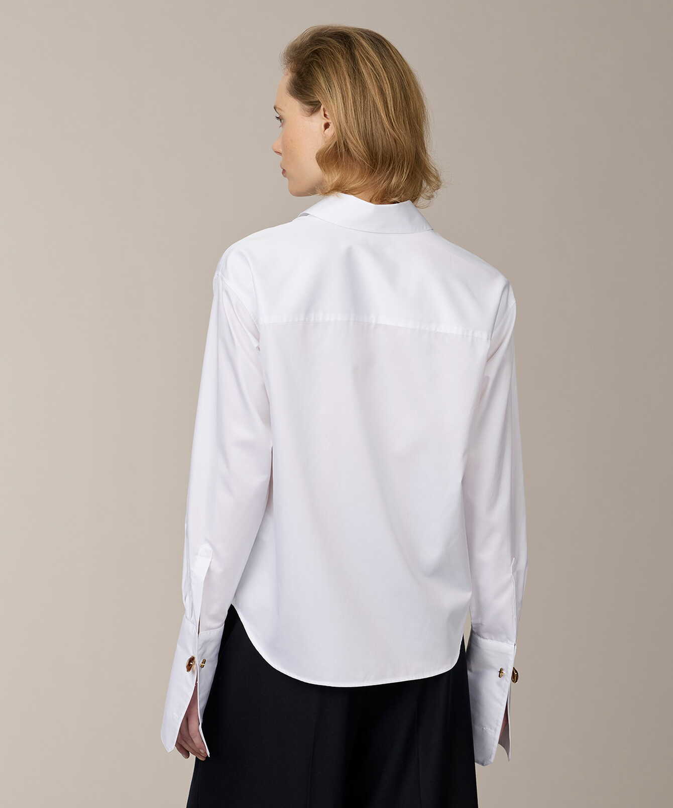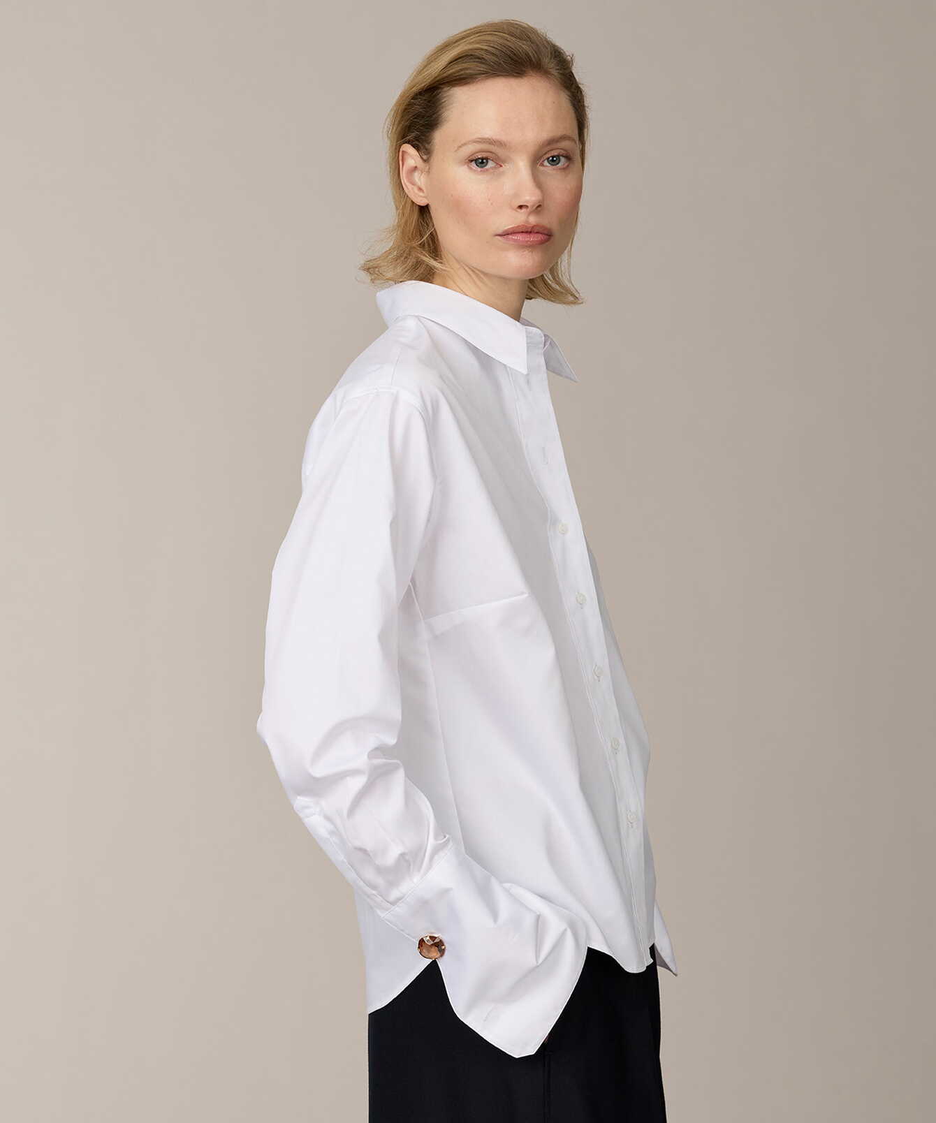 En klassisk vit skjorta med en sofistikerad känsla. Tillverkad i tunn bomullssatin som kombinerar bomullens naturliga mjukhet med en subtil glans och krispig struktur. Resultatet är ett tyg som känns lyxigt mot huden men samtidigt håller en elegant form. Den raka passformen formas av diskreta bystinsnitt och en mjukt nedhasad axel som ger en modern, avslappnad silhuett. Ärmarna avslutas med rundade dubbla manschetter, knäppta med en liten guldtonad knapp – en subtil detalj som höjer helheten. Skjortan är utrustad med Ascolite®-säkrade knappar för extra hållbarhet och finish. En tidlös skjorta med modern elegans och ett skarpt uttryck.