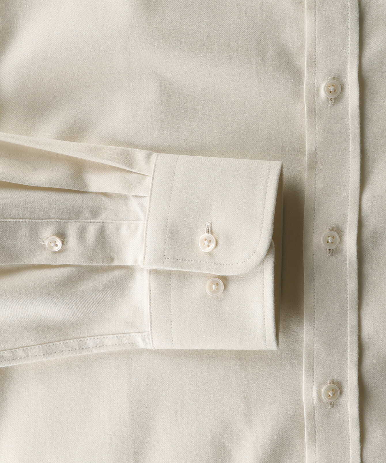 Drop down-kragen ger ett sofistikerat uttryck med modern karaktär, medan de rundade manschetterna adderar en tidlös finish. Varje knapp är säkrad med Ascolite-tråd för långvarig hållbarhet – en diskret men avgörande kvalitetssignatur.