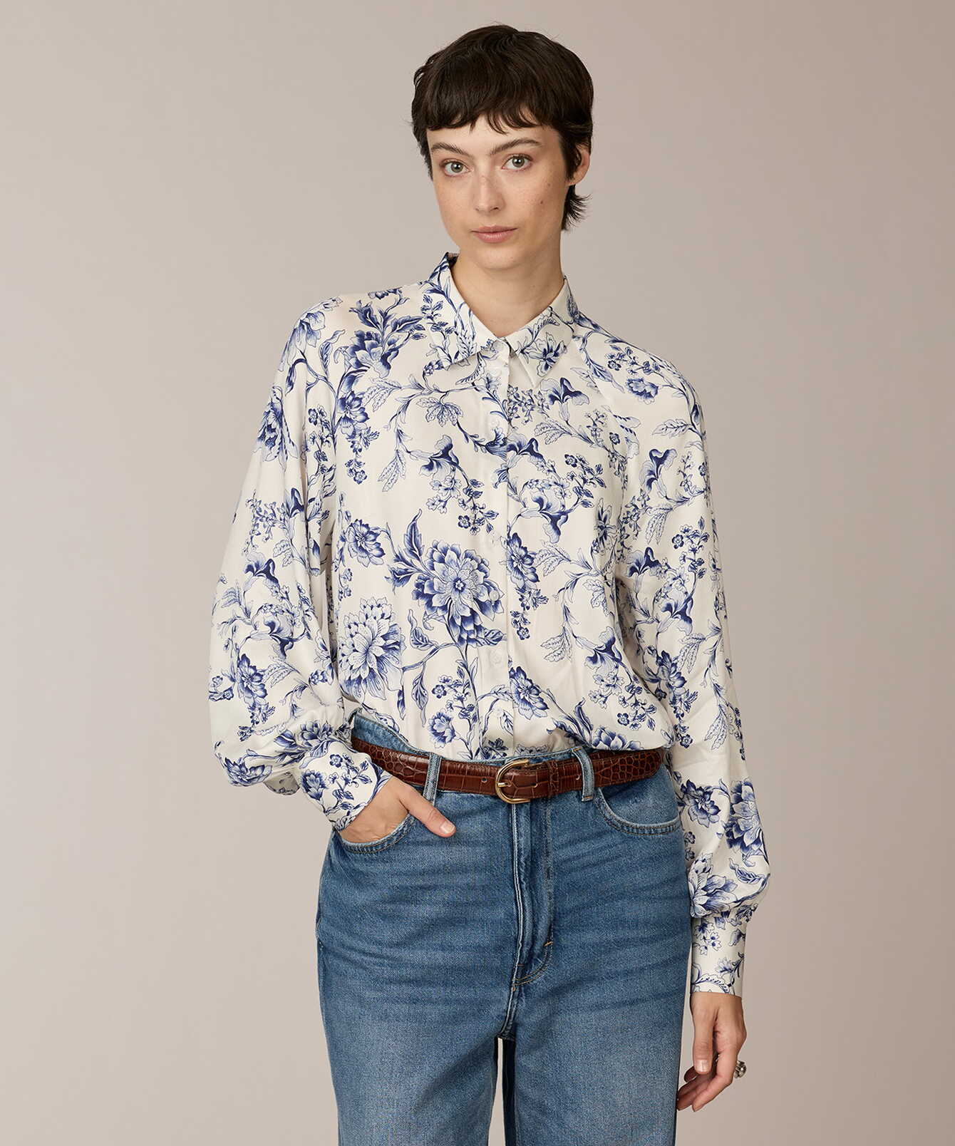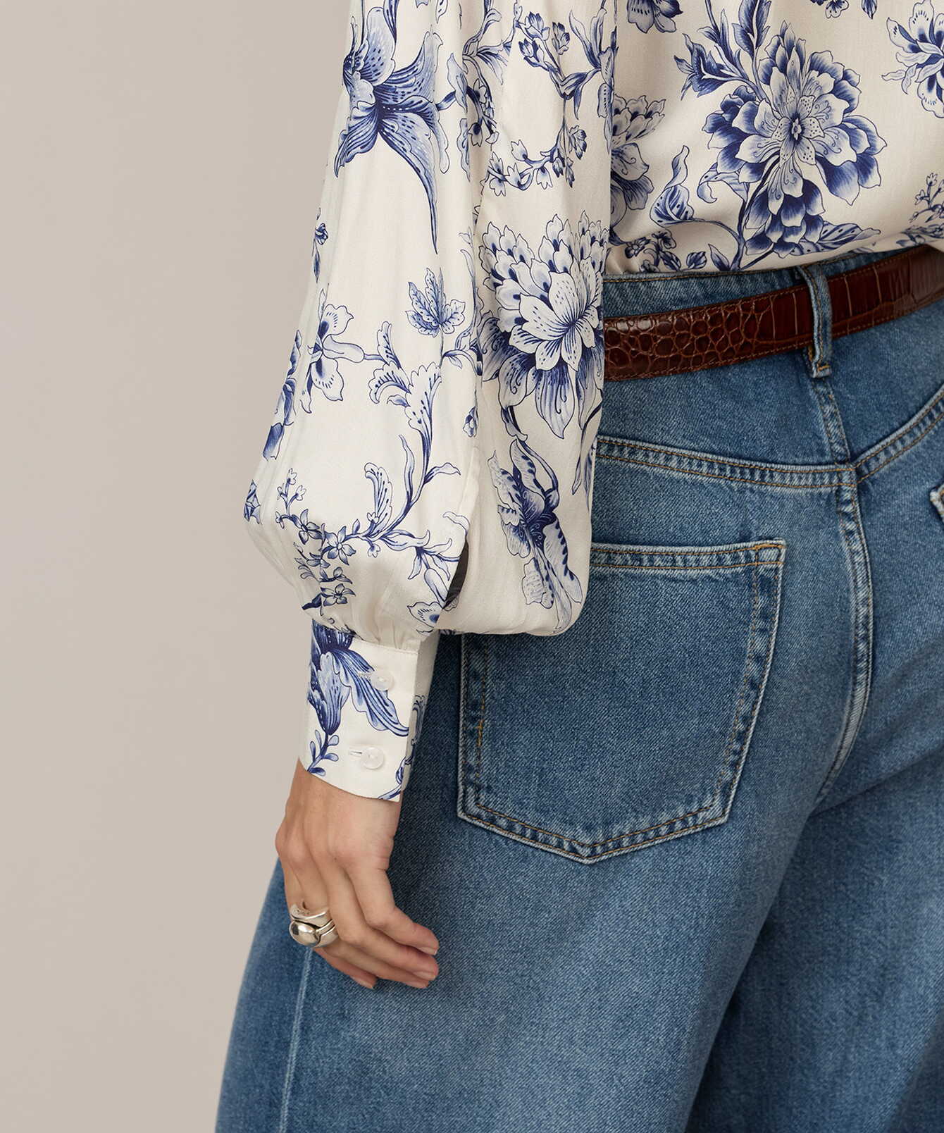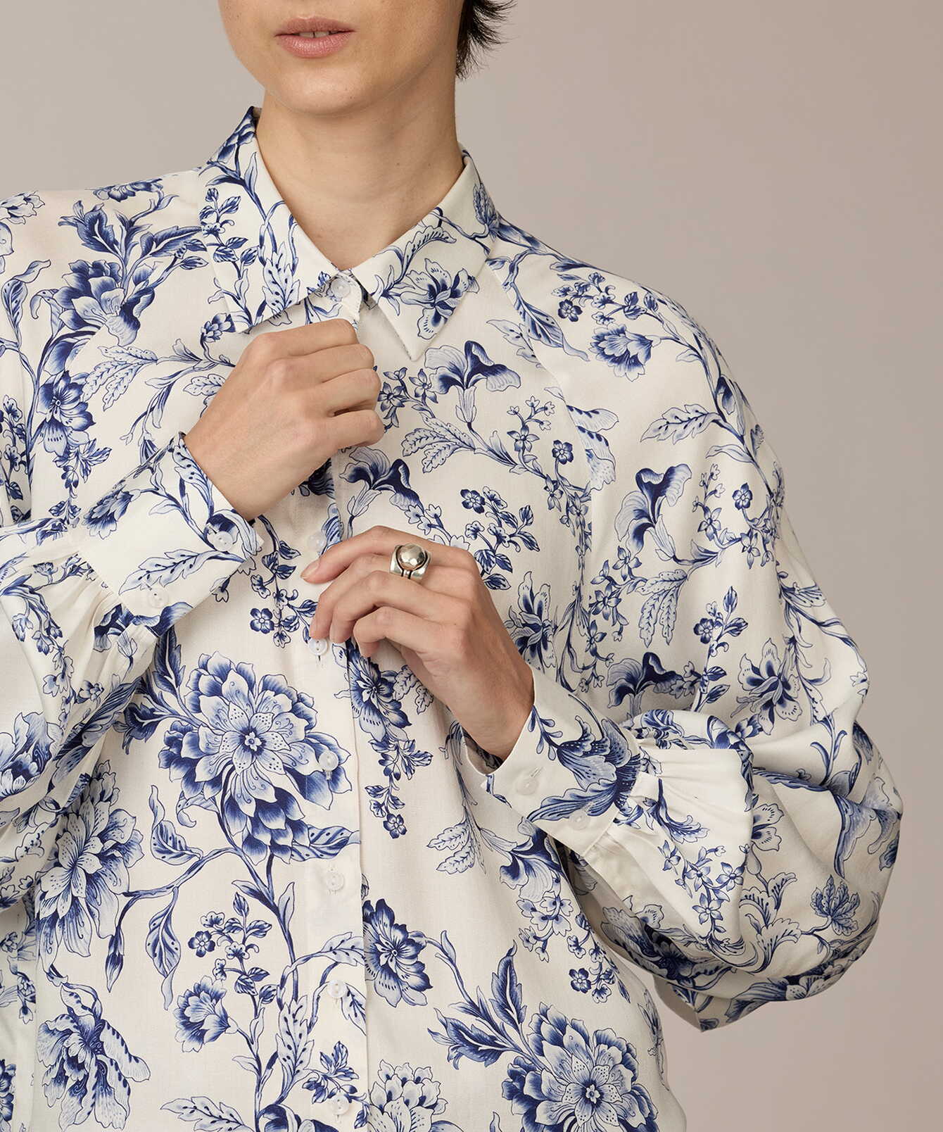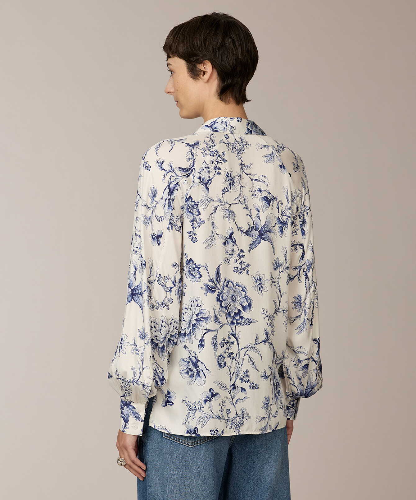 Louise Blue Satin Print är tillverkad i mjuk viskossatin med följsamt fall och subtil lyster. Det blå porslinsinspirerade mönstret ger modellen ett grafiskt men tidlöst uttryck. Den raka silhuetten balanseras av bystinsnitt som ger en nätt överdel, medan raglanskärningen och den diskreta volymen i ärmarna skapar mjuk rörelse. Dekorativa veck vid manschetterna tillför struktur och formar en modern, harmonisk linje.