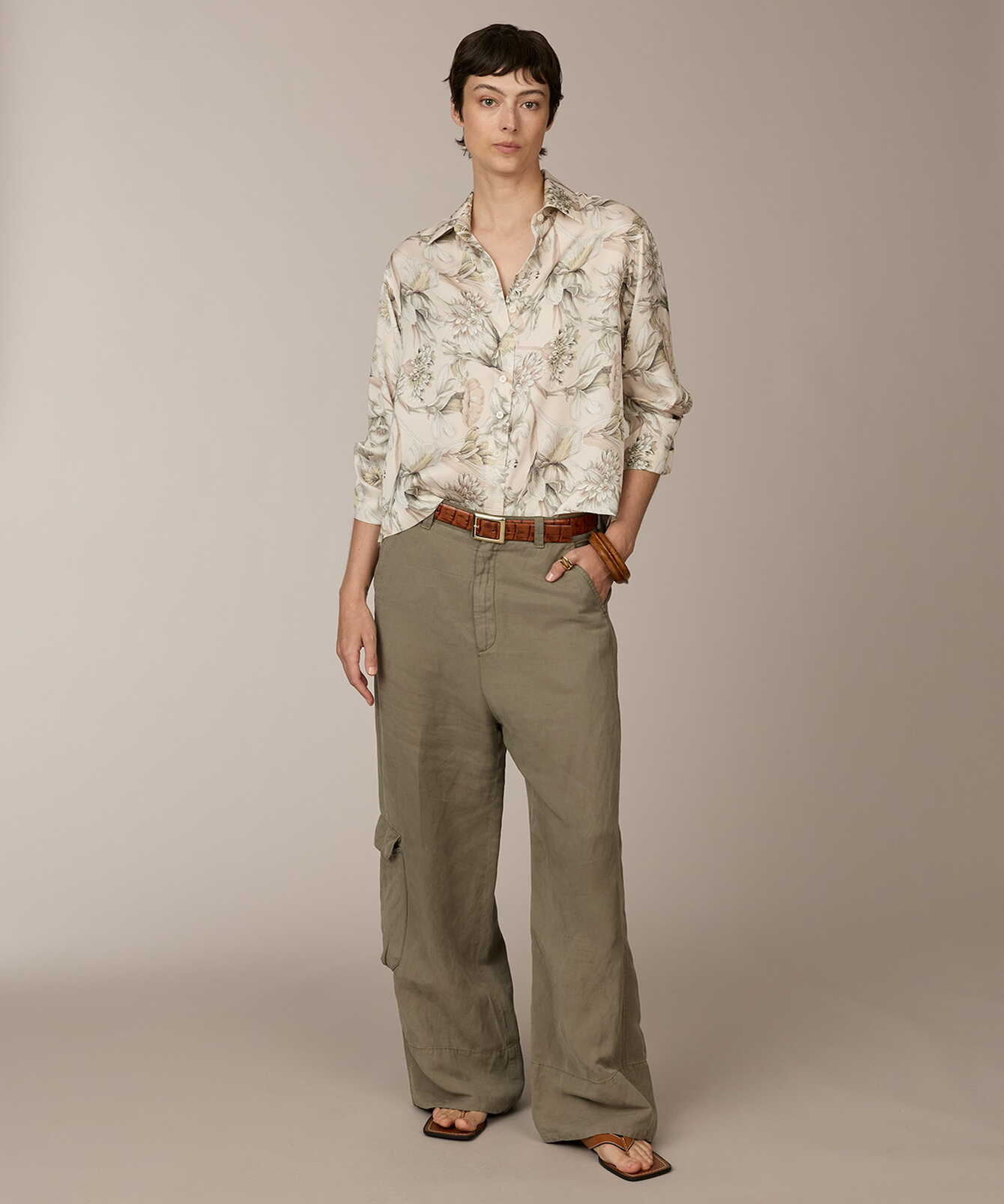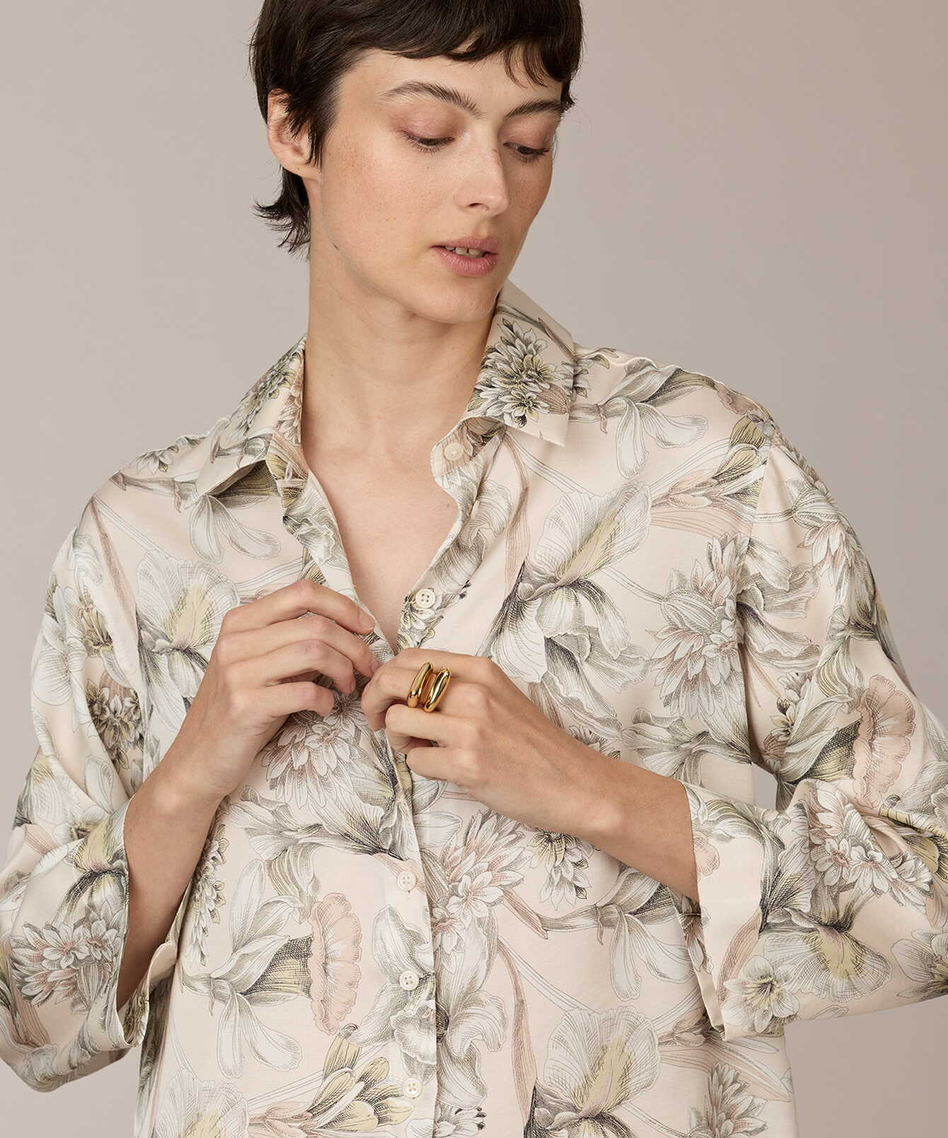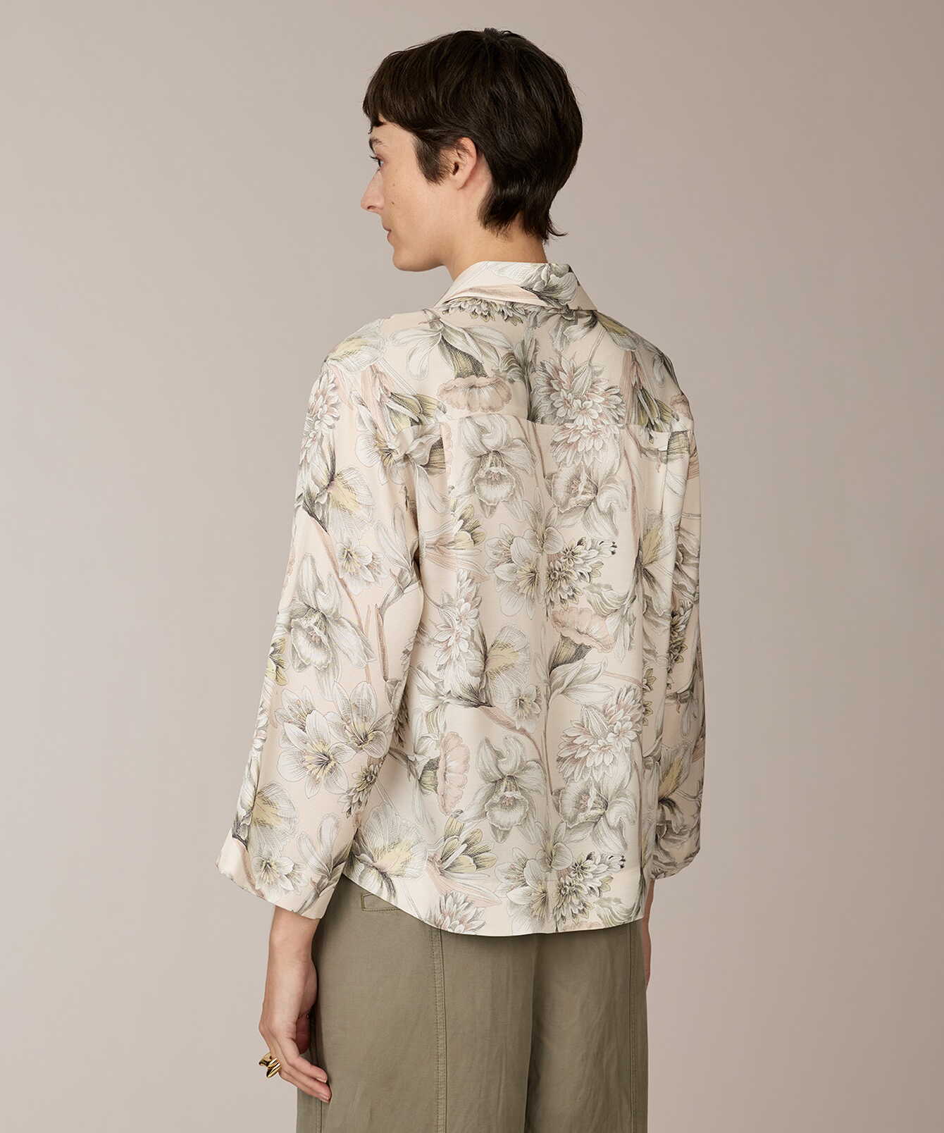 Melina Soft Petal Sketch är tillverkad i mjuk viskossatin med följsamt fall och subtil lyster. Tyget bär ett blommotiv i ljusa rosa-beige toner med diskreta gröna detaljer. Den raka silhuetten kombineras med nedhasad axel och generös ärmvidd som skapar en avslappnad och balanserad linje. Två diskreta veck i ryggen tillför rörelse, medan sidosprund ger mjuk drapering och flexibilitet. Ett genomarbetat plagg där mönster och proportion samverkar med precision.