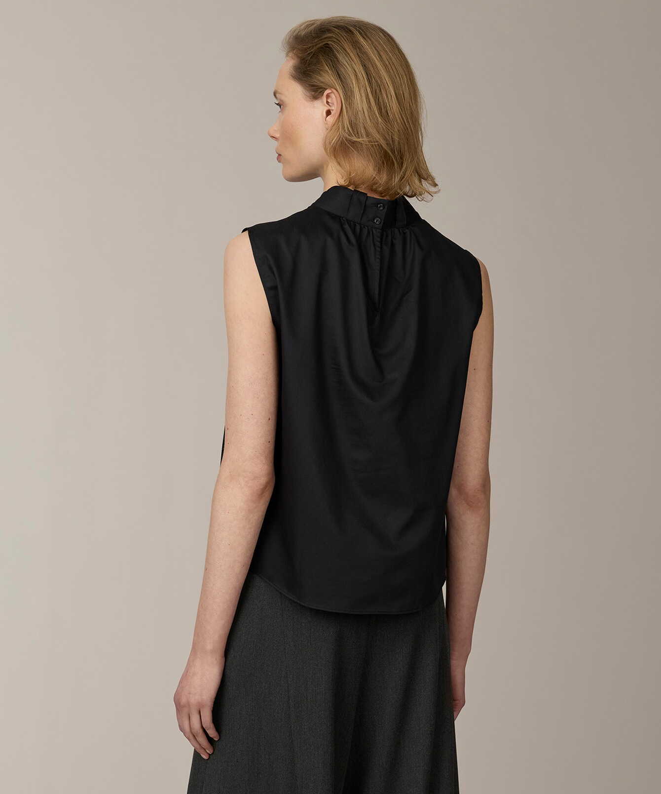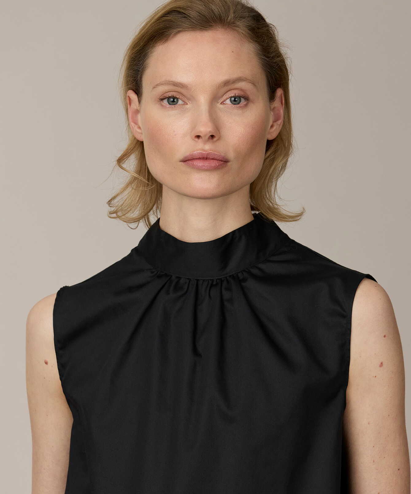 En ärmlös topp i svart bomullspoplin med en ren och sofistikerad silhuett. Det släta tyget har en lätt lyster som ger ett elegant och strukturerat uttryck.
