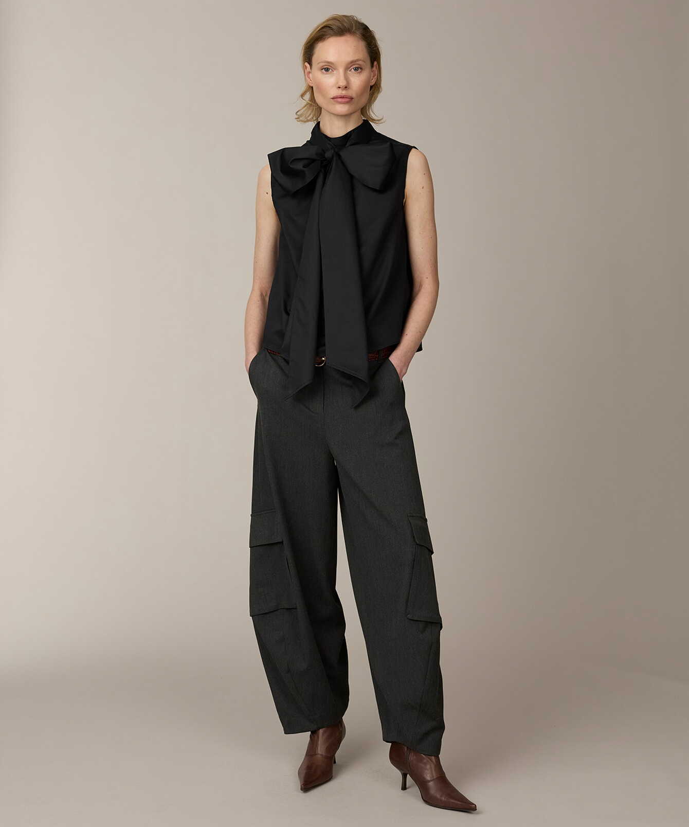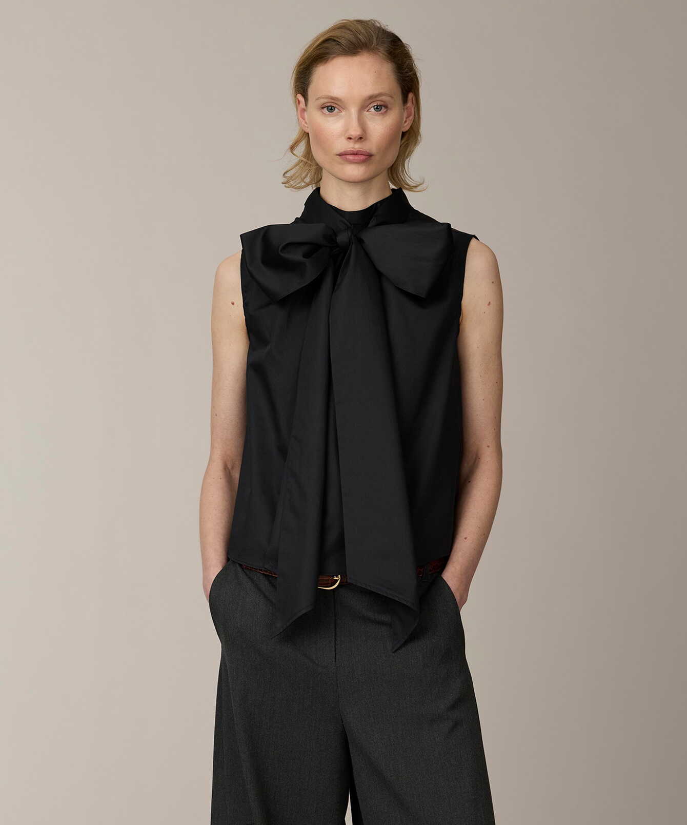 Den höga halsringningen ramas in av mjuka rynkningar som skapar ett följsamt fall. Det lösa knytbandet i halsen kan stylas på olika sätt – knyt det till en markerad rosett eller låt det falla fritt för ett mer avslappnat uttryck. Knäppning i nacken och diskreta hällor baktill håller bandet på plats.